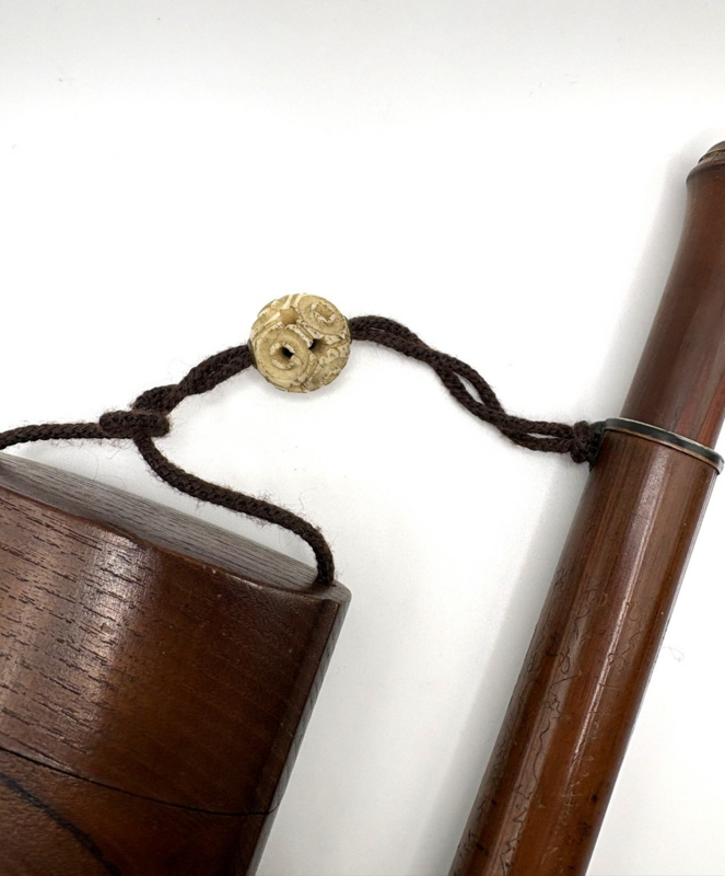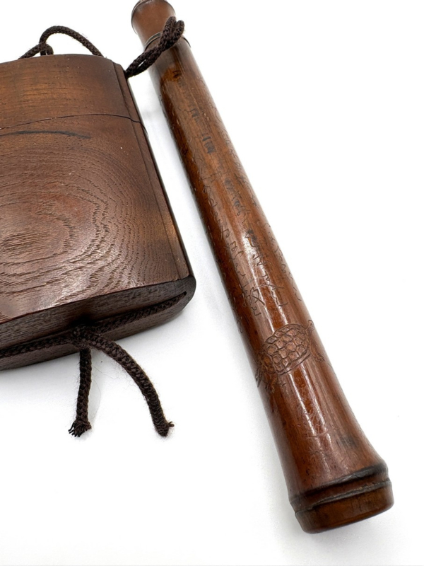 Naast de rijkelijk gedecoreerde exemplaren, is Japan ook zeer bekwaam in het vervaardigen van eenvoudige, elegante ontwerpen, die de perfecte eenheid uitstralen. Deze houten set is daar een prachtig voorbeeld van. De pijphouder is prachtig gegraveerd met Japanse tekens en een schildpad. Er zit geen kiseru bij.