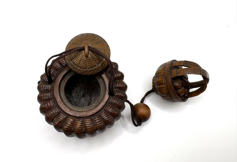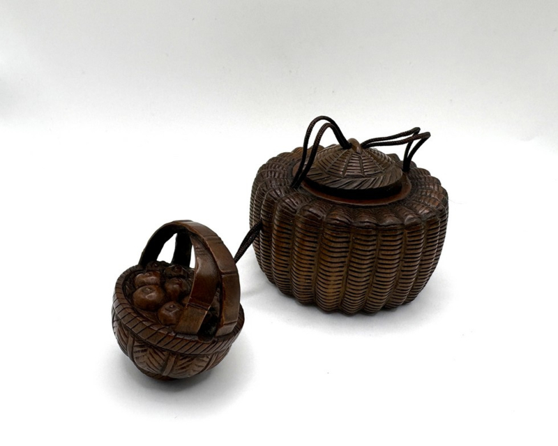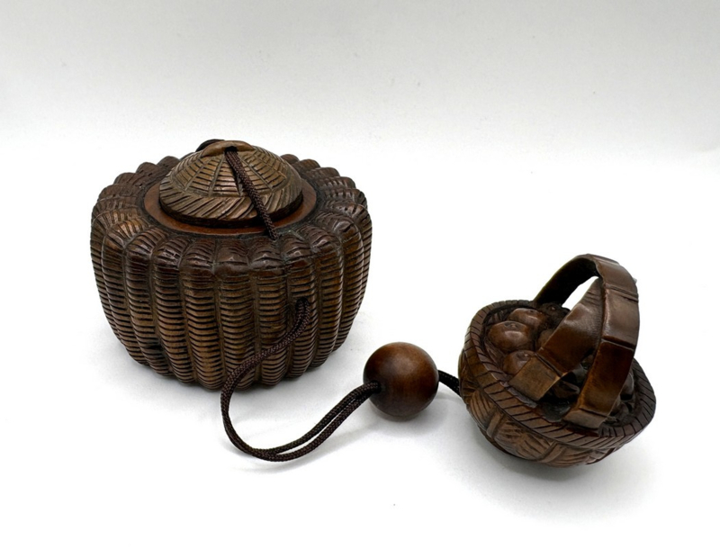 Een klein meesterwerkje - deze Japanse inro met één compartiment. Het is een prachtig gedetailleerd mandje met reliëfdecor. Aan het uiteinde van het touwtje van de inro is een netsuke van een mandje met fruit aanwezig om het geheel af te maken.