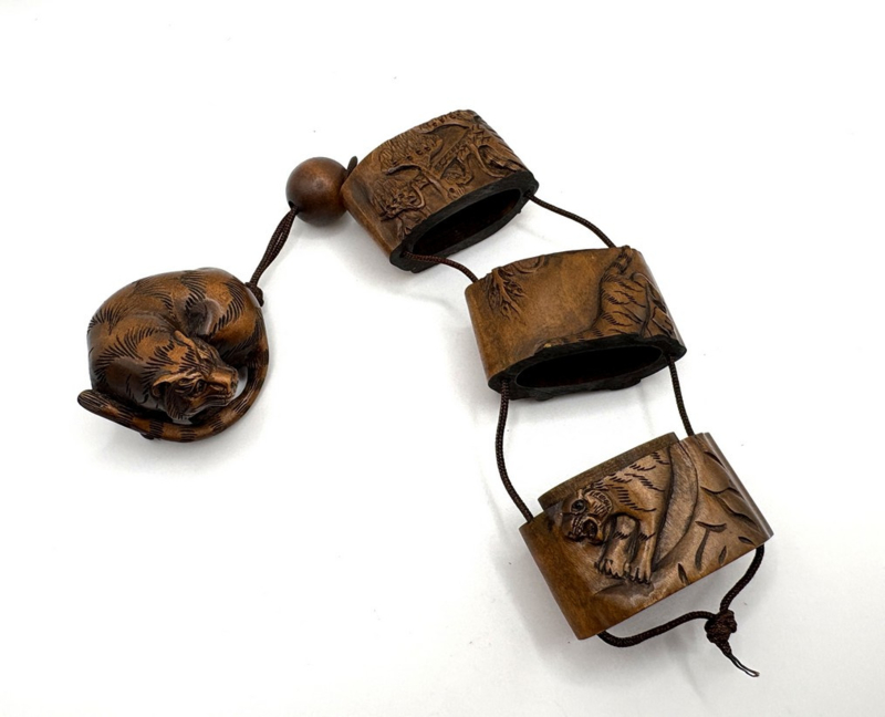 Artikelnummer: C26131Een klein meesterwerkje - deze Japanse inro met twee compartimenten en gedetailleerd reliëfdecor van tijgers. Aan het uiteinde van het touwtje van de inro is een netsuke van een tijger aanwezig om het geheel af te maken. Alle oogjes zijn ingelegd met onyx. De inro is gesigneerd aan de onderzijde.