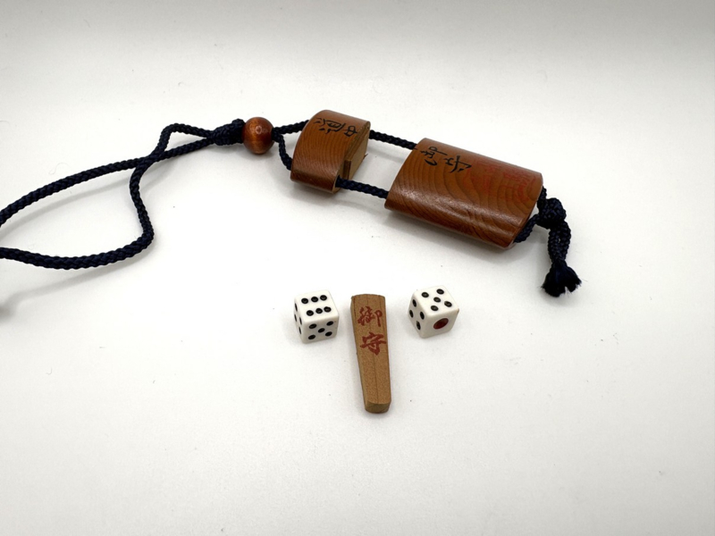 Een bijzonder klein kunstwerk - deze kleine Japanse inro met één compartiment. In de eenvoudig gedecoreerde inro bevinden zich twee dobbelsteentjes en een stokje, die werden gebruikt om te dobbelen. Men hoopte daarmee op geluk en goede uitkomsten in het leven.