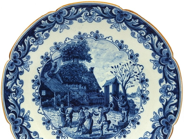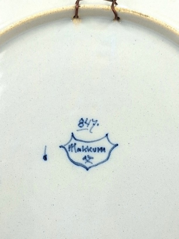 Artikelnummer: A26183Zeer rijkelijk gedecoreerd Makkum wandbord nummer 847 met feestende mensen op een binnenplaats.