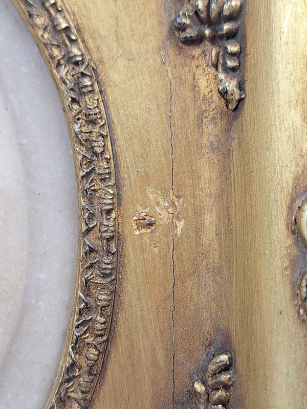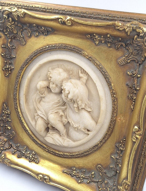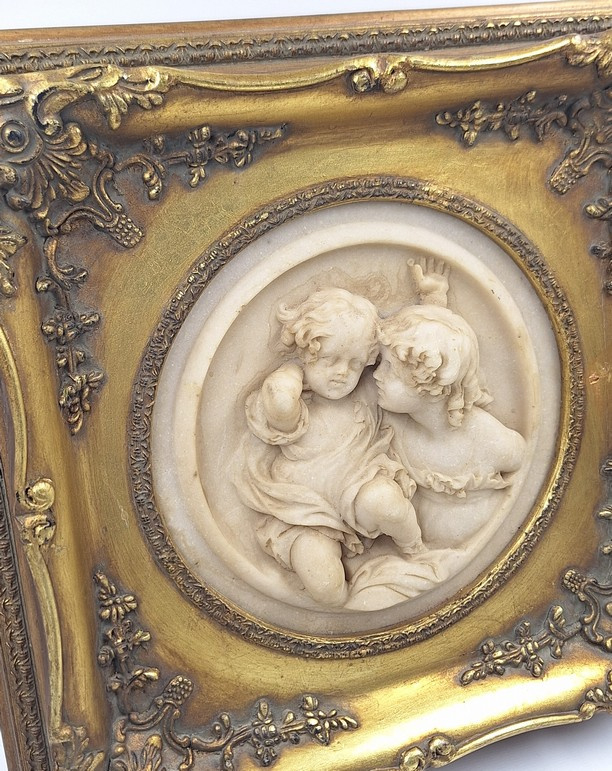 Het reliëf is geplaatst in een rijk gedecoreerde, goudkleurige lijst in barokstijl, voorzien van sierlijke ornamenten die het karakter van het werk versterken.
