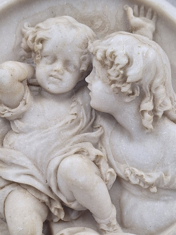 Een charmant en verfijnd wandobject, bestaande uit een fraai composiet haut-reliëf met spelende cherubijnen (putti), uitgevoerd naar een 19e-eeuws ontwerp van Edward William Wyon.