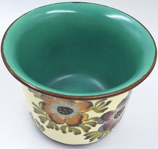 Een sfeervolle vintage bloempot uit Gouda, uitgevoerd in mat plateel en geproduceerd door Royal Plazuid. De pot dateert uit de jaren ’50-’60 en is aan de buitenzijde handbeschilderd met kleurrijke bloemen, fraai contrasterend met de crèmekleurige ondergrond en het groene glazuur aan de binnenzijde.