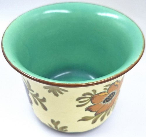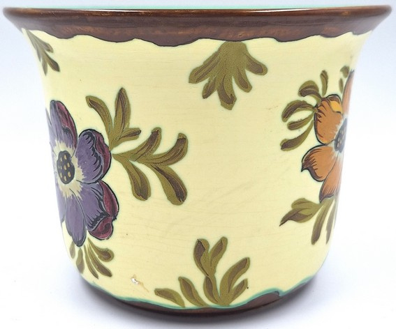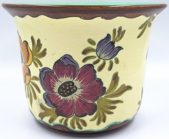 Artikelnummer: A26184Een sfeervolle vintage bloempot uit Gouda, uitgevoerd in mat plateel en geproduceerd door Royal Plazuid. De pot dateert uit de jaren ’50 - ’60 en is aan de buitenzijde handbeschilderd met kleurrijke bloemen, fraai contrasterend met de crèmekleurige ondergrond en het groene glazuur aan de binnenzijde.