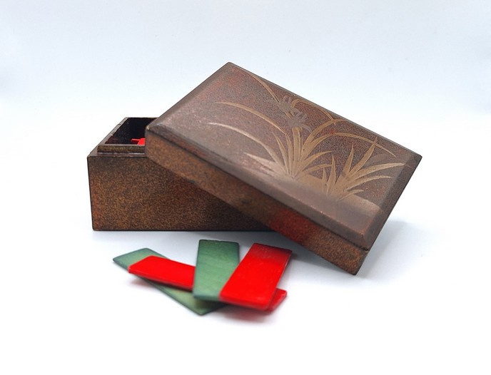 Artikelnummer: C21157Een leuk Oosters bakje met plantdecor en fiches. Het doosje heeft een glimmende afwerking en bevat 14 rode rechthoekige fiches, 19 groene rechthoekige fiches, 3 kleine rode fiches en 5 kleine groene fiches.