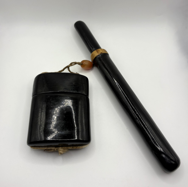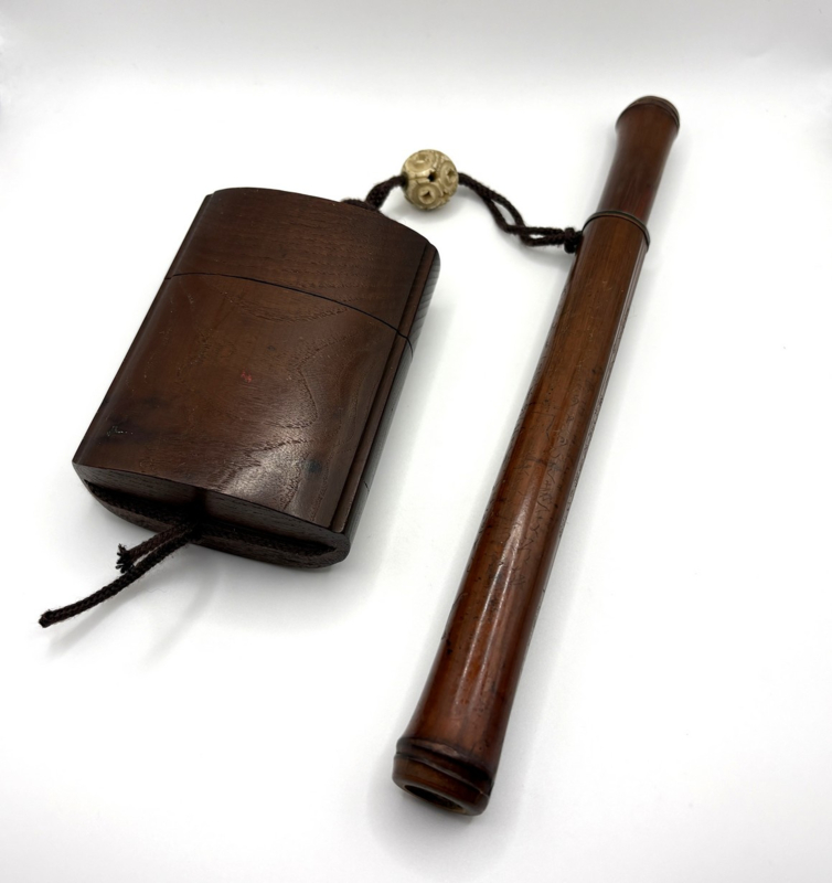 Pijphouder: breedte, 3 cm, diepte 2 cm, lengte 24 cm Tabaksdoos: lengte 9,2 cm, breedte, 7,2 cm, diepte 3,2 cm